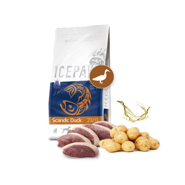 ICEPAW Scandic Duck - to pełnoporcjowa sucha karma z kaczką dla psów dorosłych oraz z nadwrażliwością pokarmową. Jest hipoalergiczna, bezglutenowa i bezzbożowa. Produkowana z mięsa dzikiej kaczki jako jedynego źródła białka zwierzęcego. Dzięki połączeniu z lekkostrawnymi ziemniakami ta hipoalergiczna sucha karma jest idealna dla dorosłych psów wrażliwych na pokarm. Polecana także w diecie eliminacyjnej, sprawdzania reakcji alergicznych na inne rodzaje zbóż lub źródła białka zwierzęcego.