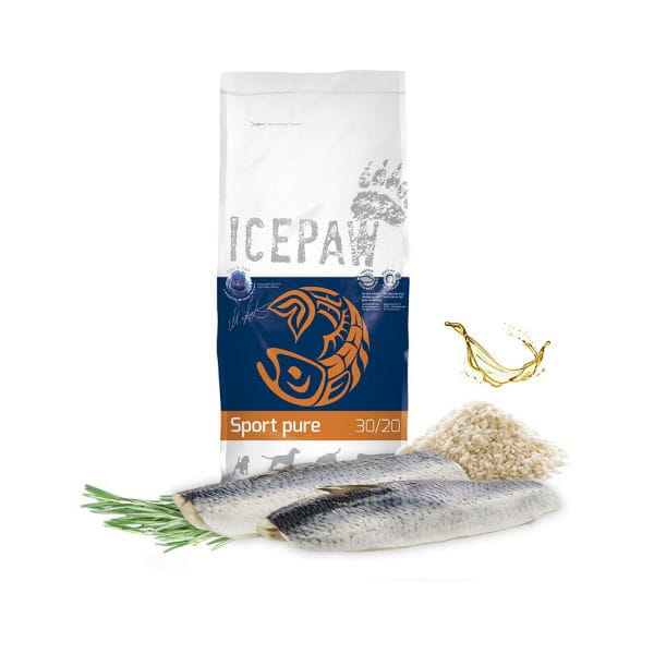 ICEPAW Sport Pure - to karma bezglutenowa. Zawiera tylko ryby jako źródło białka zwierzęcego (35% suszonego śledzia co odpowiada 87% świeżego śledzia), źródłem węglowodanów jest ryż. Cenny olej z łososia jest ważnym dodatkiem o wysokiej jakości kwasów tłuszczowych omega-3/6.