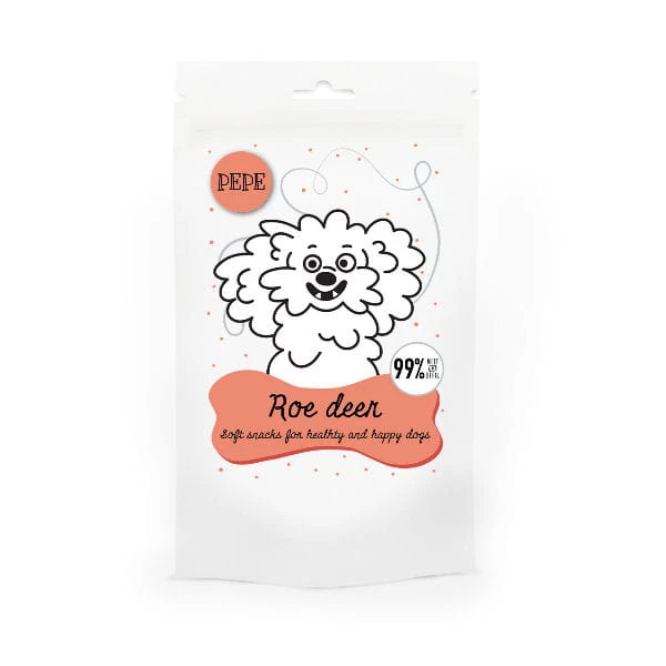 PEPE MINI CHUNKIES ROE DEER - to małe, miękkie kawałki, wykonane ze świeżo przygotowanego mięsa sarny i podrobów. Mięso pochodzi z europejskiej produkcji (hodowli prowadzonej z zachowaniem szacunku, zdrowia i dobrostanu zwierząt). Gryzaki - to naturalne przysmaki, stanowiące doskonałe uzupełnienie posiłków dla psów każdej wielkości. Suszenie ciepłym powietrzem nadaje im niezwykłej kruchości i chrupkości.