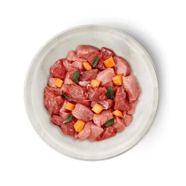 Skład: mięso królika 35%, mięso wołowe serca 31%, płuca wołowe 10%, wątroba wołowa 10%, mięso wołowe 4%, marchew 4%, proszek pomidorowy, olej rzepakowy, suszona kocimiętka, minerały.