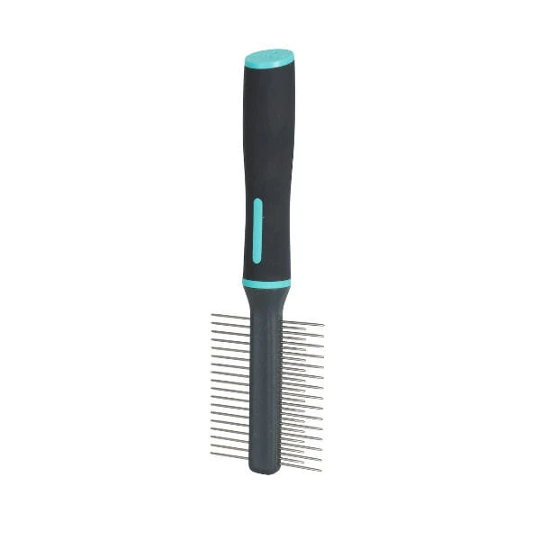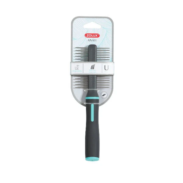 Grzebień dwustronny z gamy ANAH firmy Zolux delikatnie rozczesuje i usuwa martwy podszerstek. Strona z szeroko rozstawionymi zębami rozczesuje i wygładza sierść, zapobiegając powstawaniu kołtunów. Zaokrąglone na końcach zęby chronią skórę zwierzęcia przed podrażnieniem.