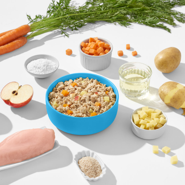 Skład: pierś z kurczaka* 38%, marchew*(24%), ziemniaki* (12%), jabłko* (11%), celuloza*(1,5%), łuski psyllium*(0,8%), olej z łososia*, olej szafranowy* , olej lniany*, minerały.