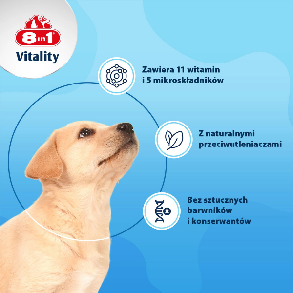 8in1 Vitality Multiwitaminy dla szczeniąt - to specjalistyczny suplement diety przeznaczony dla szczeniąt i młodych psów. Preparat zawiera zbilansowaną kompozycję 11 witamin oraz 5 mikroelementów, a także wysoką zawartość kwasów tłuszczowych omega-3 i naturalnych przeciwutleniaczy, które wspierają prawidłowy wzrost i rozwój młodego psa. Formuła została opracowana we współpracy z weterynarzami, nie zawiera sztucznych barwników ani konserwantów