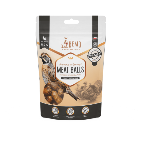 BEMO Meat Balls - to wyjątkowo smaczne połączenie mięsa z indyka z delikatnym mięsem z przepiórki, w formie aromatycznych, półmiękkich i półwilgotnych mięsnych kulek. Formuła wzbogacona o zdrowe nutraceutyki, które dbają o zdrowie i witalność Twojego psa. Doskonały sposób na zdrowe urozmaicenie diety oraz wyjątkowo smaczną nagrodę podczas treningów i spacerów.