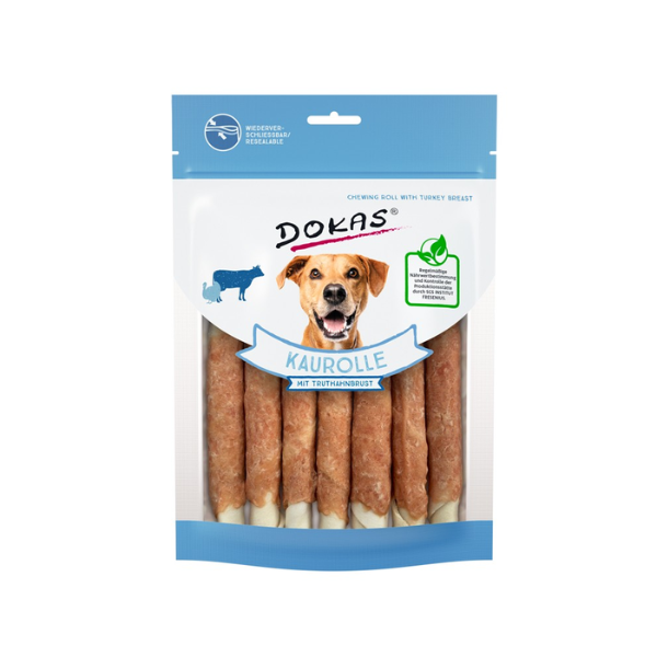 DOKAS Rolki z indykiem - to długie gryzaki ze skóry wołową owiniętą filetem z piersi indyka dla psów. Mogą być stosowane jako forma nagrody pomiędzy standardowymi posiłkami.