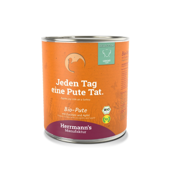 HERRMANN'S Manufaktur Light Dog Bio Pute - to monobiałkowa, pełnoporcjowa karma dla psów z niskotłuszczowego indyka, z dodatkiem warzyw bogatych w błonnik i poprawiających trawienie. W składzie znajdują się także topinambur hamujący apetyt.