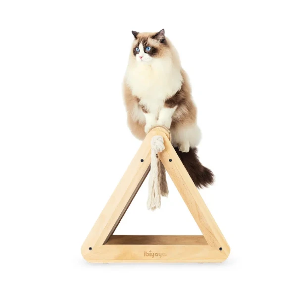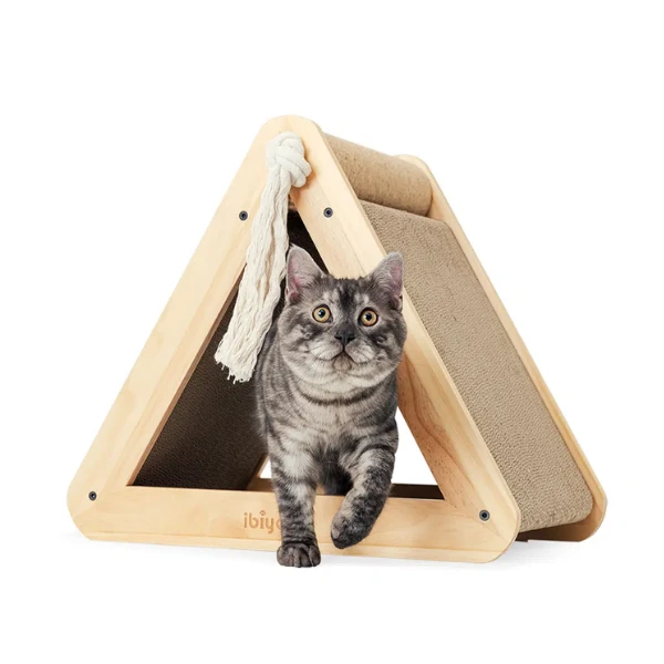IBIYAYA Hide Out - to trójkątny drapak dla kota z dwiema podkładkami z tektury falistej do drapania i liną konopną na górze. Można go przekształcić w inną wersję drapaka - w literę L. Dodatkowo zawiera jedno opakowanie kocimiętki oraz podkładki antypoślizgowe.