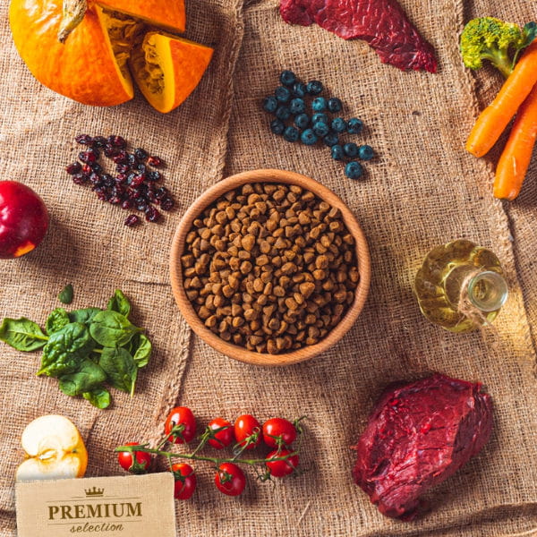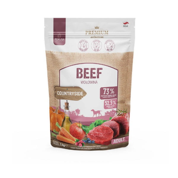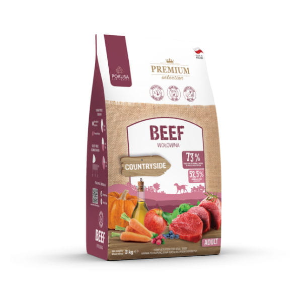 Skład: wołowina 40% (w tym 25% suszona wołowina, 15% świeża wołowina), suszone ziemniaki, tłuszcz wołowy 8%, hydrolizowane białko wieprzowe 4%, wysłodki buraczane suszone (z buraków cukrowych), suszona dynia 1%, suszona marchew 1%, suszone jabłko 1%, suszone drożdże piwne, olej z łososia 0,5%, suszona cykoria 0,5%, MOS (0,5% - mananooligosacharydy), składniki mineralne, suszona żurawina 0,2%, suszone brokuły, suszone pomidory, suszony szpinak 0,15%, glukozamina, siarczan chondroityny, suszone jagody 0,15%, ekstrakty roślinne (Yucca Mojave, Rosmarinus sp. 0,05%, Curcuma sp., Citrus sp., Eugenia sp.).