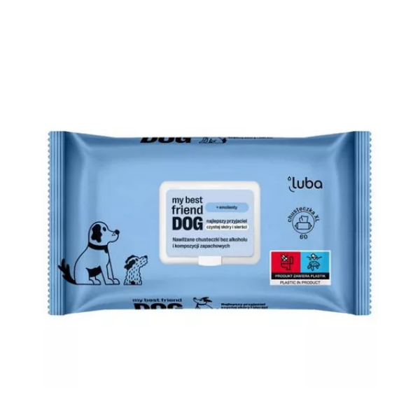 LUBA MY BEST FRIEND DOG Chusteczki do oczyszczania i ochrony skóry oraz sierści psa posiadają delikatną recepturę na bazie emolientów. Przeznaczone są do komfortowego usuwania piachu i błota z sierści psa.