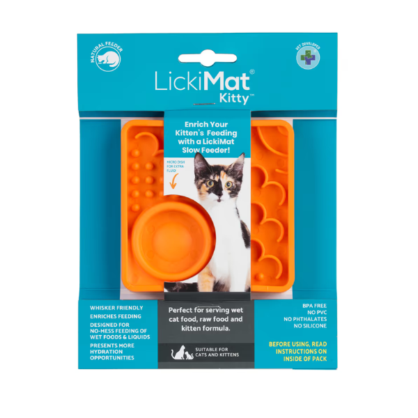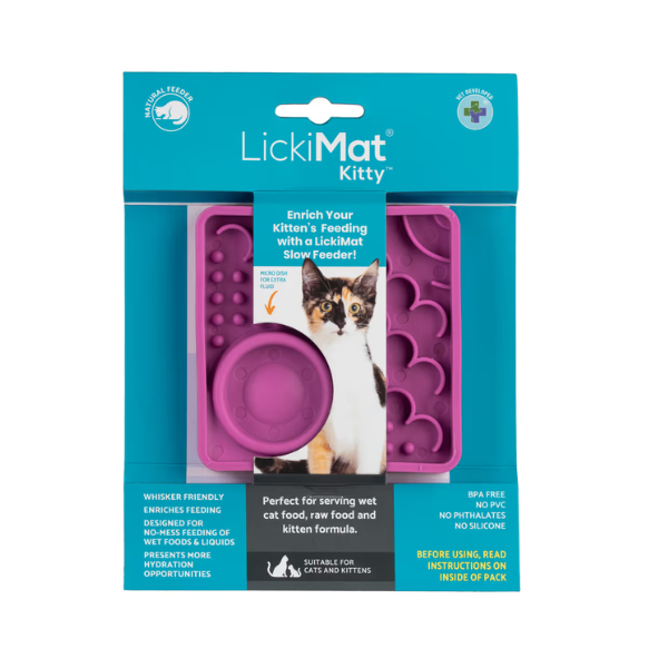 LickiMat Classic Kitty - to pierwsza mata przeznaczona specjalnie dla młodych i małych kotów. Jest płaska, więc nie drażni wibrysów oraz pozwala spożywać pokarm w pozycji kucającej z pełnym widokiem na otoczenie, co pomaga zmniejszyć stres i niepokój podczas jedzenia.