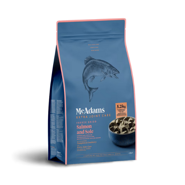 McAdams Freeze Dried MSM Salmon & Sole - to ekskluzywna, liofilizowana karma dla psów dorosłych. To, co wyróżnia ją na tle innych karm, to połączenie doskonałej, potwierdzonej certyfikatami jakości użytych składników, unikalnego procesu produkcji oraz wyjątkowego aromatu.