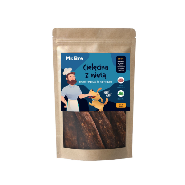 Mr. Bro Snacks Cielęcina z miętą - to przysmaki monoproteinowe z dodatkiem ziół. Produkcja odbywa się z wykorzystaniem wyłącznie polskiego mięsa po przez proces suszenia w niskich temperaturach co pozwala zachować niezbędne wartości odżywcze niż w przypadku przysmaków wypiekanych. W procesie suszenia nie są dodawane żadne środki chemiczne i konserwujące, jest to produkt w pełni naturalny.