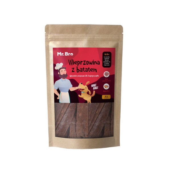 Mr. Bro Snacks Wieprzowina z batatem - to przysmaki monoproteinowe z dodatkiem batata. Produkcja odbywa się z wykorzystaniem wyłącznie polskiego mięsa po przez proces suszenia w niskich temperaturach co pozwala zachować niezbędne wartości odżywcze niż w przypadku przysmaków wypiekanych. W procesie suszenia nie są dodawane żadne środki chemiczne i konserwujące, jest to produkt w pełni naturalny. Skład to 75% mięsa mięśniowego z wieprzowiny i dodatku 25% batatów. Można je łatwo podzielić na drobniejsze części.