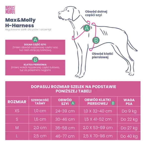 Szelki Max&Molly są dostępne w 4 rozmiarach. Dobierając odpowiednie szelki dla swojego psa, zmierz obwód dolnej części szyi psa - wymiar A w tabeli (pamiętaj, że szelki umiejscowione są nieco niżej niż obroża). Następnie, zmierz obwód klatki piersiowej, owiń centymetr krawiecki wokół najszerszej części tułowia psa, zwykle tuż za "pachami" przednich łap - wymiar B w tabeli. Jeżeli po pomiarach, mieścisz się na granicy 2 rozmiarów, zawsze wybierz ten większy.