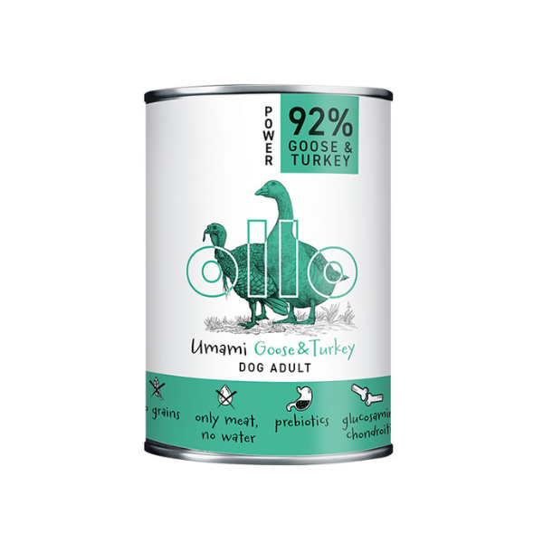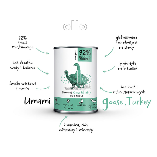 OLLO UMAMI Goose & Turkey - to pełnoporcjowa karma dla psów oparta na mięsie z gęsi i indyka Jest optymalną dietą zapewniająca psom zdrowie i energię. Psy to zwierzęta mięsożerne, których układ pokarmowy jest ukształtowany tak, aby czerpać energię z mięsa innych zwierząt. Optymalna dieta każdego psa powinna być bogata w mięso, z niewielkim dodatkiem węglowodanów.