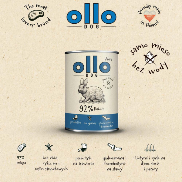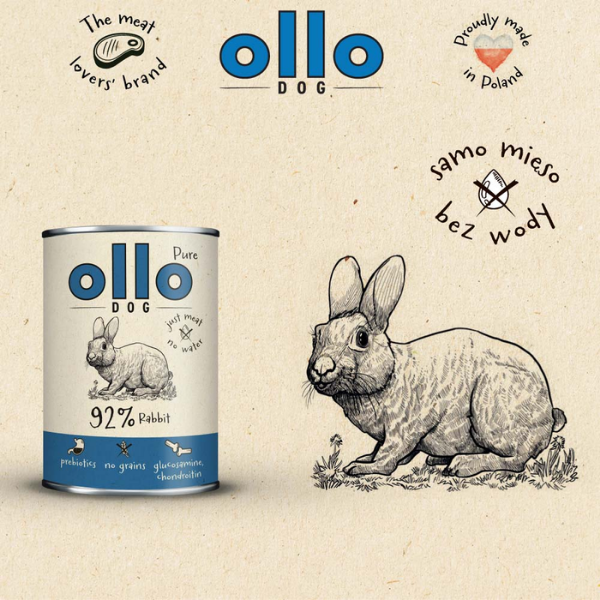 OLLO PURE Rabbit - to karma kompletna, pełnoporcjowa dla psów dorosłych wszystkich ras. Bez dodatku wody czy buliony, by niepotrzebnie nie rozcieńczać mięsa. Formuła monobiałkowa wskazana dla psów z alergią pokarmową.