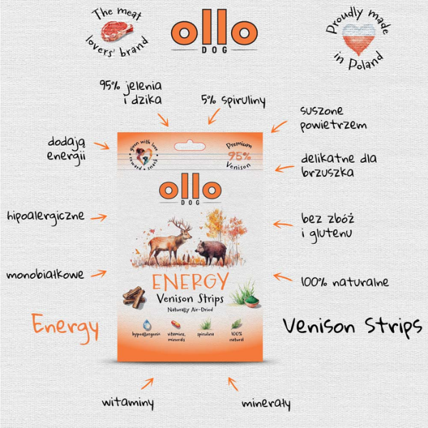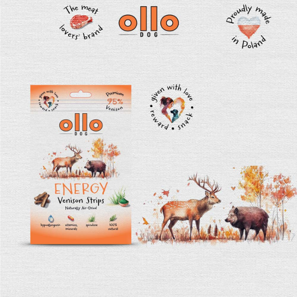 Zadbaj o energię i radość życia Twojego psa z Ollo Air Dried Energy Venision Strips!