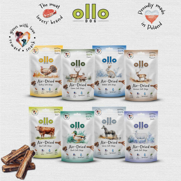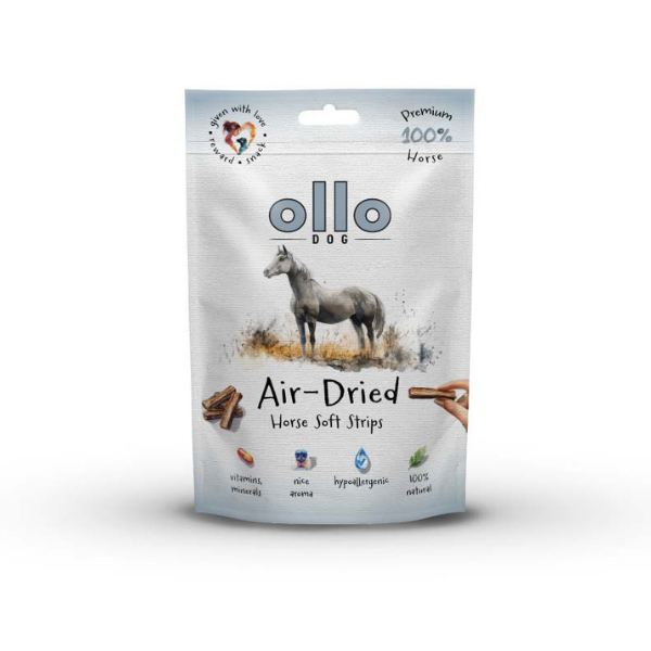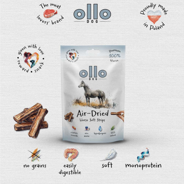 OLLO AIR DRIED HORSE STRIPS - to delikatnie suszone paski z wysokiej jakości mięsa koniny, idealne dla psów w każdym wieku i rasy.