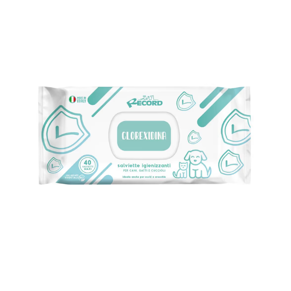 RECORD SALVIETTE CLOREXIDINA - to chusteczki nawilżane dla psów i kotów, przeznaczone do pielęgnacji miejsc wrażliwych - oczu, uszu, pyska, okolic intymnych i fałdek skórnych. . Zostały nasączone substancjami myjącymi, które w łagodny i bezpieczny sposób usuwają zabrudzenia, nadmiar sebum i złuszczony naskórek. Pomagają zebrać z sierści luźny włos, eliminują nieprzyjemne zapachy. Nie posiadają alkoholu, silikonów i barwników. Zostały wzbogacone chlorheksydyną, to substancja odkażająca, działa bakteriobójczo i bakteriostatycznie.
