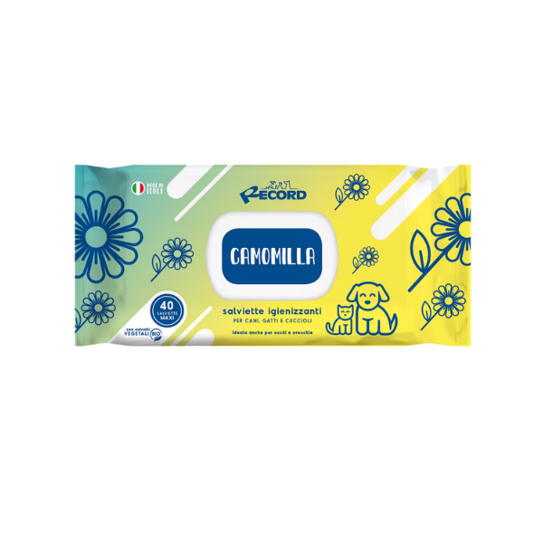 RECORD SALVIETTE CAMOMILLA - to chusteczki nawilżane dla psów i kotów, przeznaczone do pielęgnacji miejsc wrażliwych - oczu, uszu, pyska, okolic intymnych i fałdek skórnych. Zostały nasączone substancjami myjącymi, które w łagodny i bezpieczny sposób usuwają zabrudzenia, nadmiar sebum i złuszczony naskórek. Pomagają zebrać z sierści luźny włos, eliminują nieprzyjemne zapachy. Nie posiadają alkoholu, silikonów i barwników. Zostały wzbogacone wyciągiem z rumianku, który działa przeciwzapalnie, przeciwbakteryjnie i przyspiesza gojenie ran.