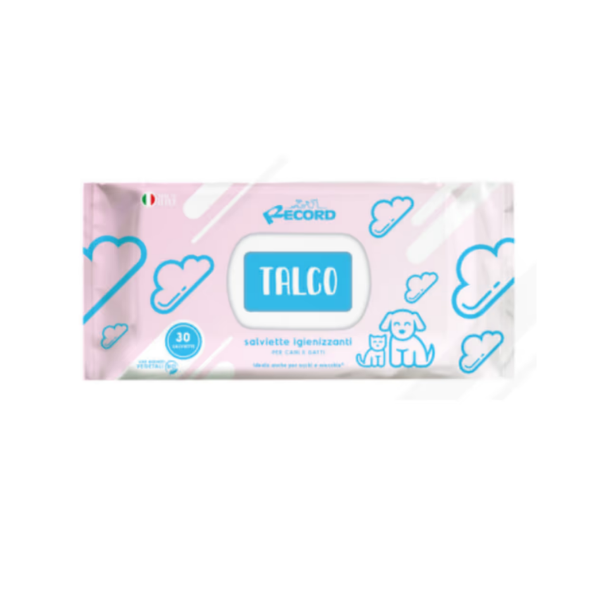 RECORD SALVIETTE TALCO - to chusteczki nawilżane dla psów i kotów, przeznaczone do pielęgnacji miejsc wrażliwych - oczu, uszu, pyska, okolic intymnych i fałdek skórnych. Mogą być stosowane również u szczeniąt. Zostały nasączone substancjami myjącymi, które w łagodny i bezpieczny sposób usuwają zabrudzenia, nadmiar sebum i złuszczony naskórek. Pomagają zebrać z sierści luźny włos, eliminują nieprzyjemne zapachy. Nie posiadają alkoholu, silikonów i barwników. Zostały wzbogacone talkiem, który zabezpiecza skórę przed podrażnieniami.