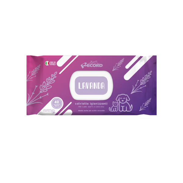 RECORD SALVIETTE LAVANDA - to chusteczki nawilżane dla psów i kotów, przeznaczone do pielęgnacji miejsc wrażliwych - oczu, uszu, pyska, okolic intymnych i fałdek skórnych. . Zostały nasączone substancjami myjącymi, które w łagodny i bezpieczny sposób usuwają zabrudzenia, nadmiar sebum i złuszczony naskórek. Pomagają zebrać z sierści luźny włos, eliminują nieprzyjemne zapachy. Nie posiadają alkoholu, silikonów i barwników. Wzbogacone ekstraktem z lawendy, który łagodzi podrażnienia, uspokaja działa przeciwzapalnie i antybakteryjnie.