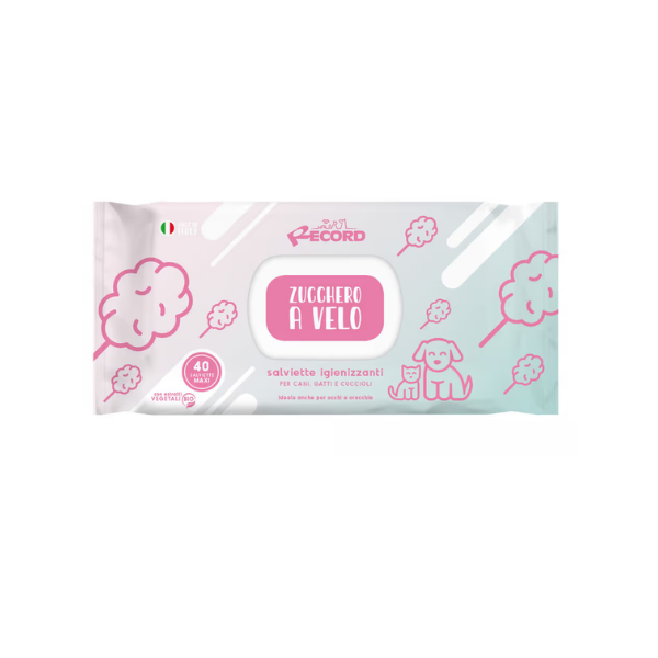 RECORD SALVIETTE ZUCCHERO A VELO - to chusteczki nawilżane dla psów i kotów, przeznaczone do pielęgnacji miejsc wrażliwych - oczu, uszu, pyska, okolic intymnych i fałdek skórnych. Mogą być stosowane również u szczeniąt. Zostały nasączone substancjami myjącymi, które w łagodny i bezpieczny sposób usuwają zabrudzenia, nadmiar sebum i złuszczony naskórek. Pomagają zebrać z sierści luźny włos, eliminują nieprzyjemne zapachy. W swym składzie nie zawierają alkoholu, silikonów i barwników. Posiadają przyjemną, słodką woń waty cukrowej.