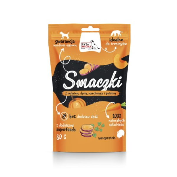 SYTA MICHA Smaczki z indykiem, dynią, marchewką i batatami - to idealnie dobrana kompozycja składników odżywczych, zamknięta w jednym opakowaniu, o niesamowitych walorach smakowych i zapachowych dla naszych czworonogów. Mięsne przysmaki z indykiem, dynią, marchewką i batatami to zdrowa nagroda dla psa, pozbawiona sztucznych dodatków i konserwantów, dzięki czemu może być podawana szczeniętom, dorosłym psom jak również seniorom.