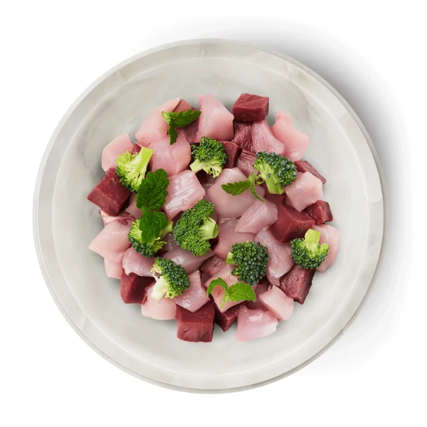 Skład: serce wołowe (42%), mięso królicze (31%), wątroba wołowa, brokuły (4%), proszek pomidorowy*, olej rzepakowy, olej rybi, kocimiętka*, minerały *suszone