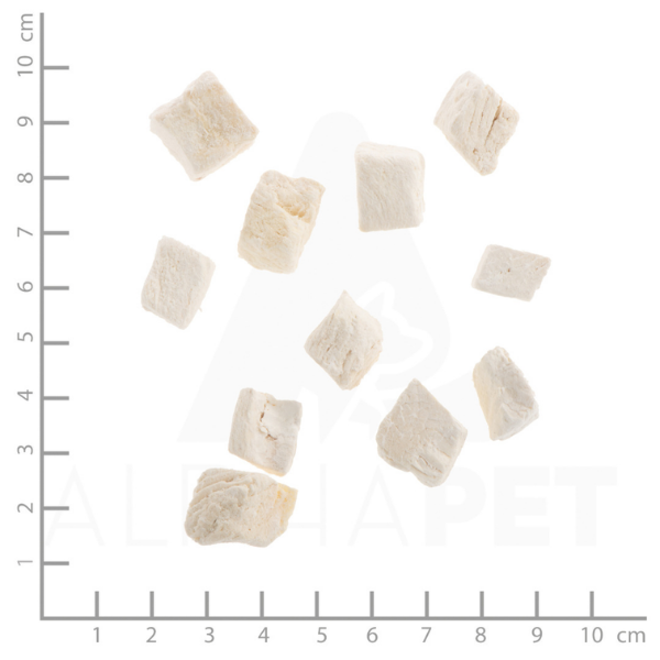 Liofilizowane przysmaki składają się w 99% z mięsa kurczaka. Mięso najpierw kroi się w kostki i zamraża. Następnie ciecz jest usuwana za pomocą próżni w specjalnym procesie liofilizacji. W ten sposób wszystkie składniki odżywcze zostają zachowane. Dzięki temu Twój kot otrzyma wysokiej jakości białka i ważne składniki odżywcze, nawet gdy dostanie małe przekąski. Ponieważ przysmaki nie zawierają żadnych sztucznych składników, są nie tylko wyjątkowo smaczne, ale także wyjątkowo dobrze tolerowane.