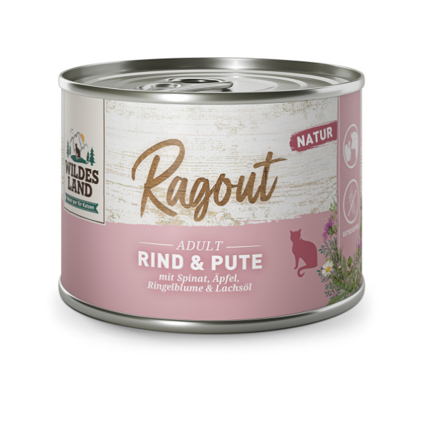 WILDES LAND CAT Ragout Rind & Pute - to kawałki soczystej wołowiny i indyka, które zaspokoją najbardziej wybrednych kocich smakoszy. Karmę uzupełniają wartościowe owoce, warzywa i olej z łososia.