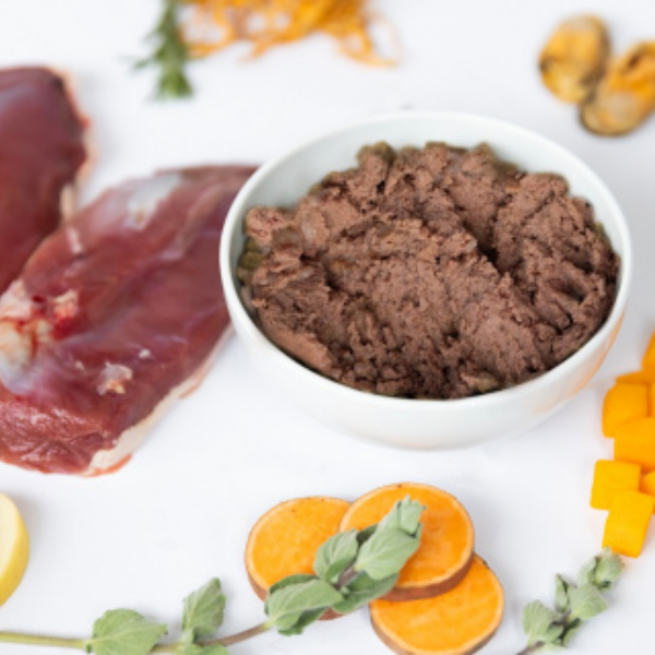 Skład: 90% świeża kaczka (70% mięso mięśniowe, 20% organy wewnętrzne), 5% bataty, 3% mieszanka prozdrowotna: (banan (5982 mg/kg), karczoch (4486 mg/kg), cykoria (4813 mg/kg), lucerna (2393 mg/kg), jabłka (2094 mg/kg), dynia (1794 mg/kg), żurawina (1495 mg/kg), małża zielonowargowa 1346 mg/kg), zielona herbata (1196 mg/kg), rozmaryn (1047 mg/kg), tymianek (897 mg/kg), oregano (748 mg/kg), ostropest plamisty (269 mg/kg), spirulina (239 mg/kg), oliwa z oliwek (209 mg/kg), jukka, cordyceps (179 mg/kg), shiitake, mniszek lekarski, imbir, kurkuma), 1% olej z pstrąga, glukozamina (1000 mg/kg), chondroityna (850 mg/kg), MSM (650 mg/kg).