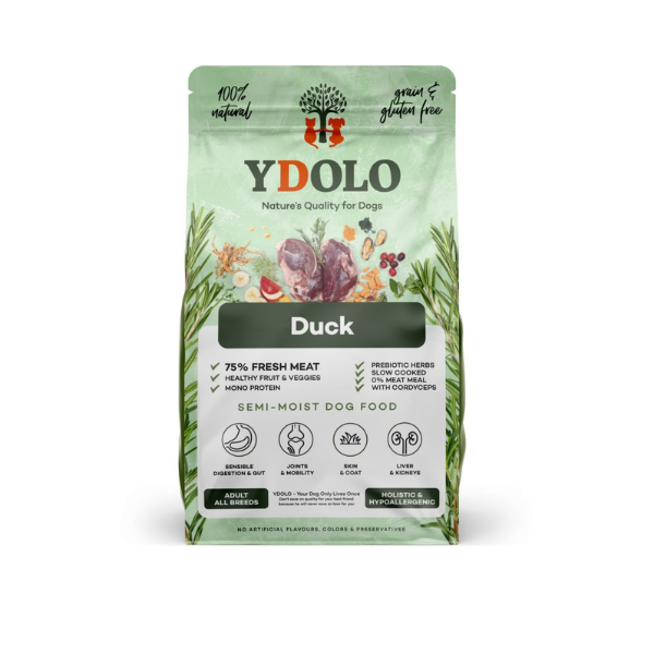To półwilgotna, pełnoporcjowa karma produkowana metodą tłoczenia na zimno. Karma jest monobiałkowa, z jednym źródłem białka zwierzęcego o krótkim i jasnym składzie, dlatego może być polecana psom na diecie eliminacyjnej. Karma YDOLO odpowiednia jest także dla starszych psów. Jest łatwiejsza do spożycia również przez psy z chorobami przyzębia lub brakami w uzębieniu.