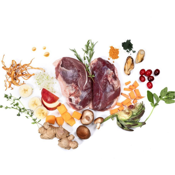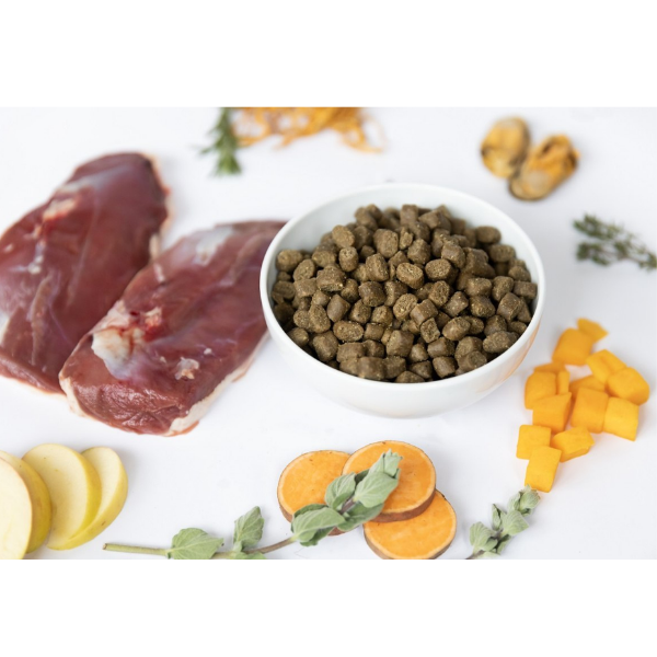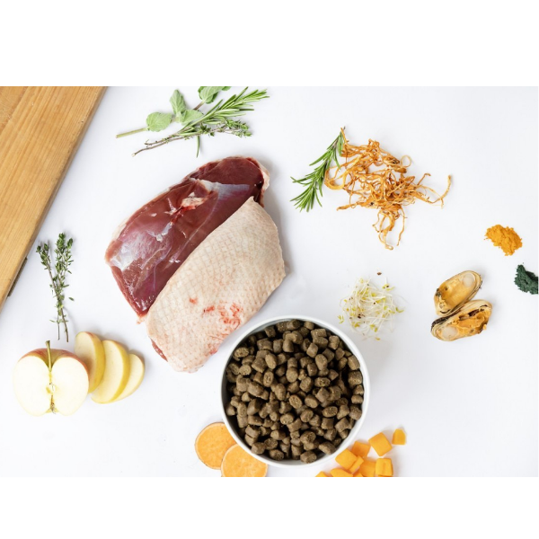 Skład: 75% świeże mięso z kaczki, 20% bataty, 3% mieszanka zdrowotna: (banan (5982 mg/kg), karczoch (4486 mg/kg), cykoria (4813 mg/kg), lucerna (2393 mg/kg), jabłka (2094 mg/kg), dynia (1794 mg/kg), żurawina (1495 mg/kg), małża zielonowargowa (1346 mg/kg), zielona herbata (1196 mg/kg), rozmaryn (1047 mg/kg) , tymianek (897 mg/kg) oregano (748 mg/kg), ostropest plamisty (269 mg/kg), spirulina (239 mg/kg), oliwa z oliwek (209 mg/kg), juka, kordyceps (179 mg/kg ), shiitake, mniszek lekarski, imbir, kurkuma), 1% olej z pstrąga, glukozamina (1000 mg/kg), chondroityna (850 mg/kg), MSM (650 mg/kg).