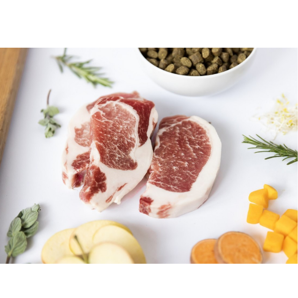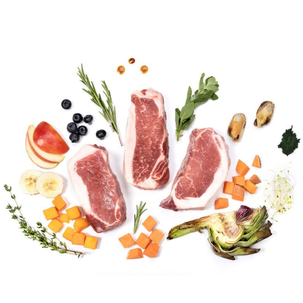 Skład: 75% świeżej wieprzowiny Iberico, 20% batatów, 3% mieszanki zdrowotnej: (banan (5982 mg/kg), karczoch (5085 mg/kg), cykoria, lucerna (2991 mg/kg), jabłka (2692 mg/kg), dynia (2393 mg/kg), jagody (2094 mg/kg), małża zielonowargowa (1196 mg/kg), rozmaryn (897 mg/kg), tymianek (598 mg/kg), oregano (449 mg/kg), ostropest plamisty, spirulina (239 mg/kg), oliwa z oliwek, juka), 1% olej z pstrąga, glukozamina (1000 mg/kg), chondroityna (850 mg/kg), MSM (650 mg/kg).