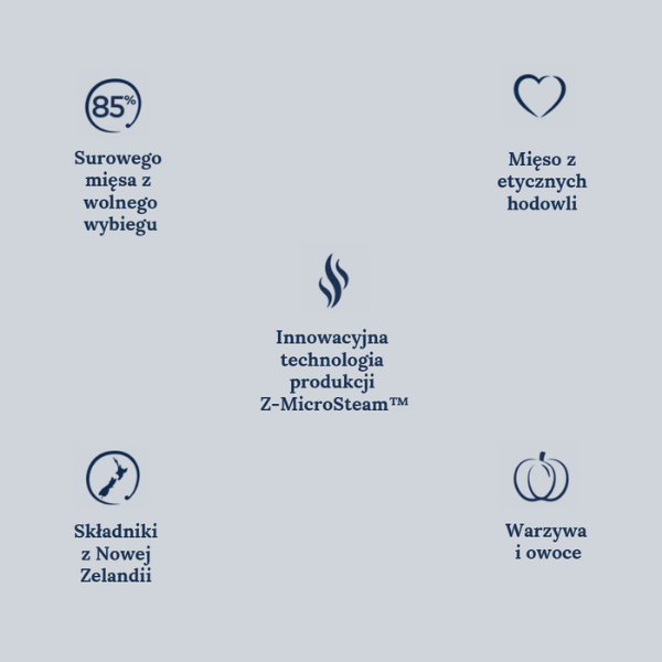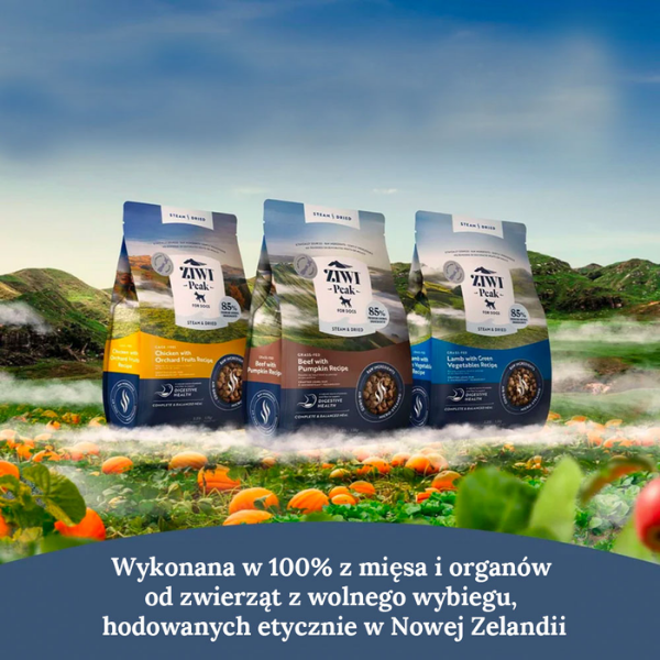 ZiwiPeak STEAM&DRIED jest wytwarzany w 85-90% z surowego mięsa, organów i owoców morza z dodatkiem owoców i warzyw przy użyciu technologii Z-MicroSteam. Technologia ta zapewnia lekką, delikatną i smaczną konsystencję. Karma ta jest przeznaczona dla właścicieli psów i kotów, którzy chcą zapewnić bardziej holistyczną i inkluzywną dietę z uwzględnieniem owoców i warzyw, gdzie podstawą jest surowe mięso.