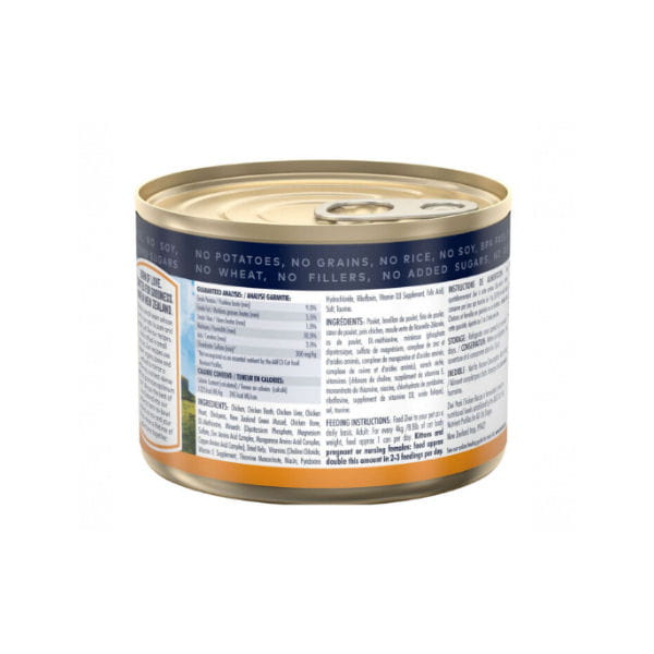 Skład: kurczak, woda niezbędna w procesie produkcji, wątroba drobiowa, serce kurczaka, groszek, małże nowozelandzkie, kość kurczaka, DL-metionina, minerały (fosforan dipotasu, siarczan magnezu, kompleks aminokwasów cynku, kompleks aminokwasów manganu, kompleks aminokwasów miedzi ), suszone wodorosty, witaminy (chlorek choliny, suplement witaminy E, monoazotan tiaminy, niacyna, chlorowodorek pirydoksyny, ryboflawina, suplement witaminy D3, kwas foliowy), sól, tauryna.