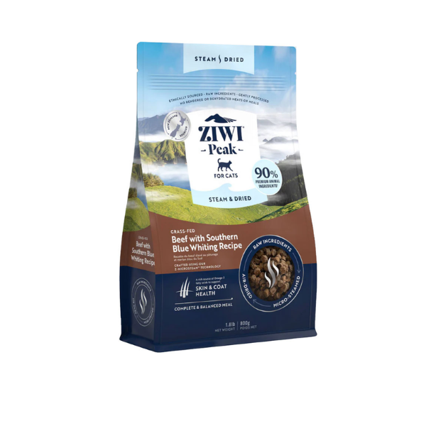 ZiwiPeak BEEF WITH SOUTHERN BLUE WHITING - to sucha, idealnie zbilansowana karma z wołowiną i błękitkiem południowym dla kotów. Surowa wołowina z wolnego wybiegu pozyskiwana jest z etycznych źrodeł prosto z Nowej Zelandii, która jest jednym z najczystszych krajów na świecie.