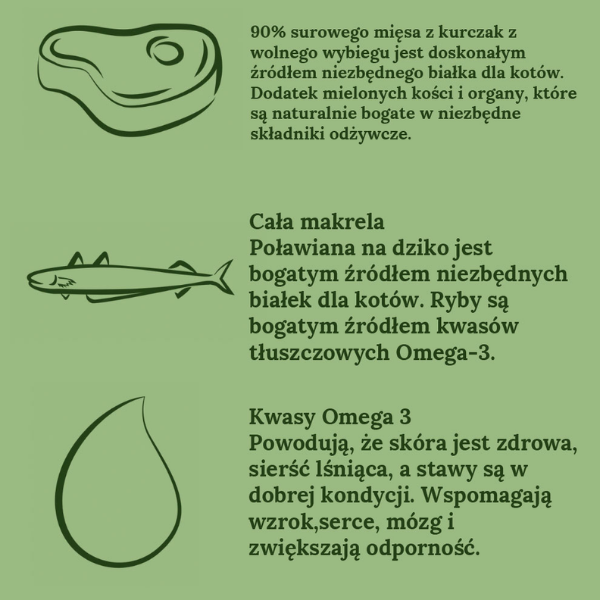 - 90% najwyższej jakości surowego mięsa i organów oraz ryb serwowanych w całości,
