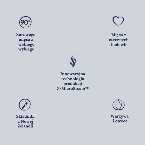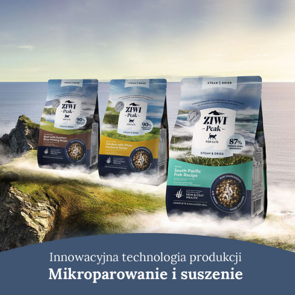 ZiwiPeak - to pochodzące z Nowej Zelandii, w 100% naturalne hypoalergiczne karmy najwyższej światowej klasy ULTRA PREMIUM. Posiadają wszechstronne właściwości prozdrowotne. Żaden składnik tej karmy nie jest przetwarzany genetycznie (GMO). W karmie suchej znajduje się 96% mięsa. Dzięki unikalnemu procesowi produkcji, bez przetwarzania komponentów w wysokich temperaturach, karma zachowuje wszystkie cenne składniki odżywcze. Jest idealnie zbilansowana i osiąga 95% przyswajalności.