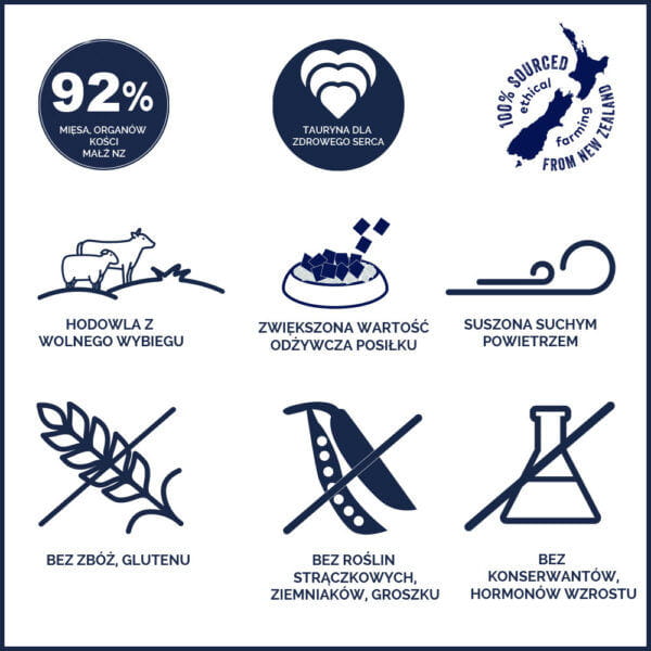 Wszystkie składniki pochodzą z organicznych i ekologicznych hodowli z Nowej Zelandii i posiadają certyfikaty najwyższej klasy spożywczej. Skomponowane zgodnie z normami żywieniowymi AAFCO oraz z normami UE.