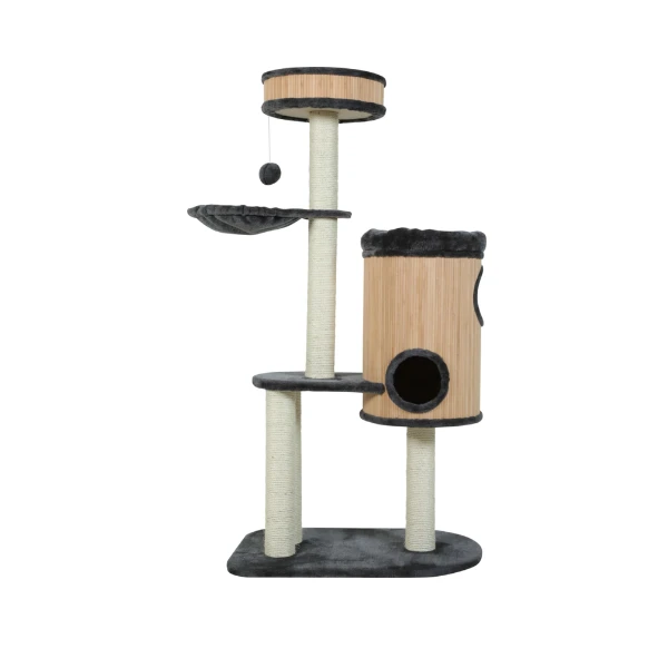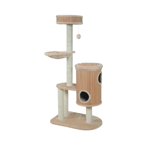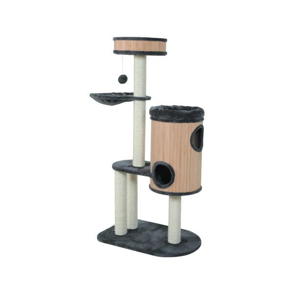 Drapak BAMBOO 4 - to duża bambusowa beczka z dwoma wejściami pełniąca funkcję kryjówki, zwieńczoną wygodnym legowiskiem z futrem syntetycznym, z platformą do obserwacji, hamakiem oraz komfortowym koszykiem-legowiskiem, usytuowanym w najwyższym punkcie drapaka. Drapak posiada liczne słupki pokryte plecionym sizalem, które umożliwiają kotu zaspokojenie naturalnej potrzeby ścierania pazurów, a także wyposażony jest w wiszącą zabawkę, która obudzi w zwierzęciu instynkt łowiecki.