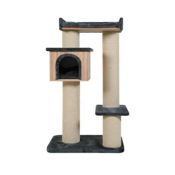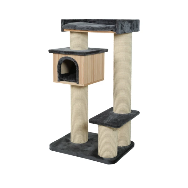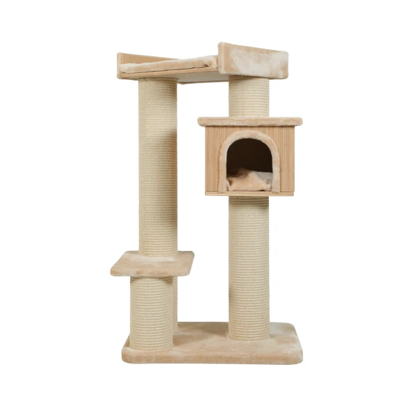 Drapak BAMBOO 6 to: bambusowa budka wyścielona miękkim futrem syntetycznym, platforma oraz komfortowe legowisko usytuowane na szczycie drapaka. Produkt posiada liczne słupki XXL o średnicy 17 cm pokryte plecionym sizalem, które umożliwiają kotu zaspokojenie naturalnej potrzeby ścierania pazurów, a także wyposażony jest w wiszącą zabawkę, która obudzi w zwierzęciu instynkt łowiecki.