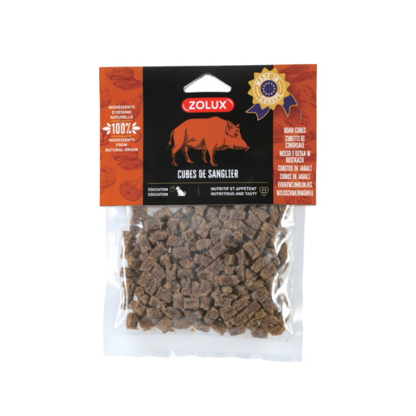 ZOLUX Kostki z dzika - to idealne uzupełnienie codziennej porcji pożywienia. Przysmak w postaci kostek z suszonego mięsa z dzika jest niezwykle apetyczną, łatwostrawną i bogatą w białko przekąską dla psa, w 100% ze składników pochodzenia naturalnego. Dzięki odpowiedniej obróbce termicznej nie wymaga użycia konserwantów i sprawdzi się jako nagroda podczas treningu.