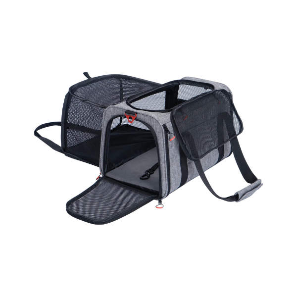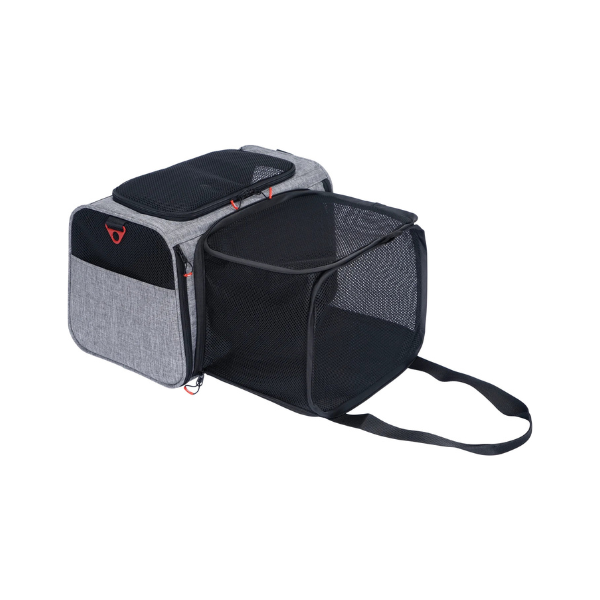 - System dodatkowej przestrzeni: składany element rozszerzający pozwala znacząco powiększyć wnętrze torby, dając zwierzęciu swobodę ruchów podczas postoju czy wizyty w poczekalni.