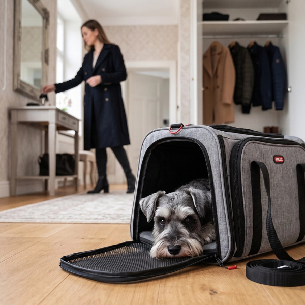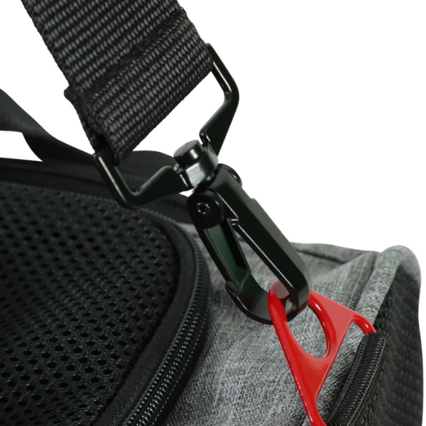 - Bezpieczeństwo przede wszystkim: wewnętrzny pasek z karabińczykiem umożliwia pewne przypięcie szelek lub obroży, co skutecznie zapobiega ucieczce zwierzęcia po otwarciu torby.